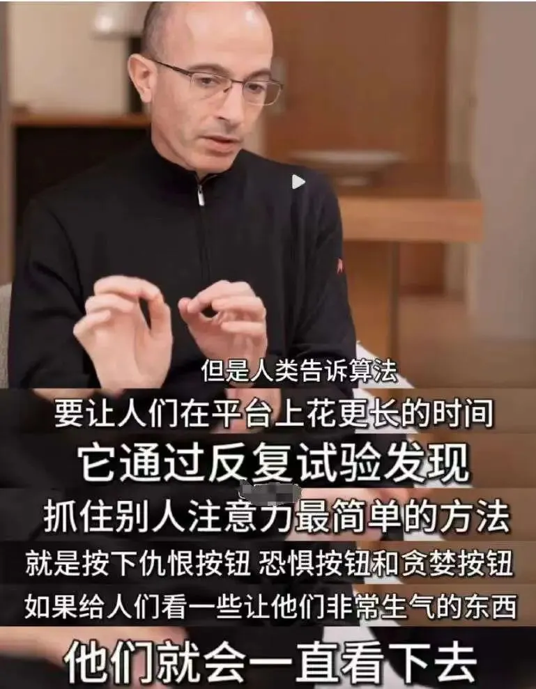 《人类简史》的作者尤瓦尔·赫拉利,曾在采访中谈及算法对人性的抓取: